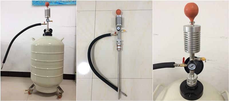 該產(chǎn)品依靠操作者手捏吸液球(ZYB-5型),使液氮容器內(nèi)貯存的液氮少量產(chǎn)生氣化。由于液氮的氣液體積比較大,氣化后的氮氣在密封的容器內(nèi)對盛裝的液氮增壓,促使容器內(nèi)盛裝的液氮排放出來,達到對其它容器補充液氮的目的。它具有操作方便可靠、排液過程中液氮的蒸發(fā)損失低的優(yōu)點。